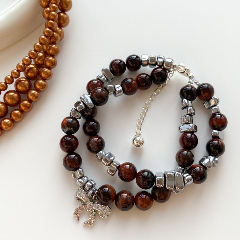 Браслет на стальном тросике из розового кварца, перламутра, аквамарина, агата и снежного кварца (термически обработанное стекло) с застёжкой-карабином, размер камней 6 и 8 мм. Бусины расположены на специальном шнуре из металлических жилок, которые переплетены между собой и покрыты полимерной оболочкой. Тросик не растягивается, хорошо держит форму украшения. Браслет на стальном тросике характеризуется надёжностью и долговечностью.