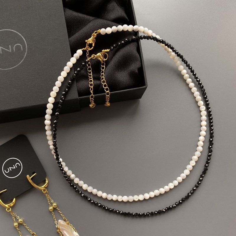 Чокер с застёжкой-карабином с культивированным речным жемчугом. Размер камней 2, 6 и 8 мм. Бусины расположены на специальном шнуре из металлических жилок, которые переплетены между собой и покрыты полимерной оболочкой.